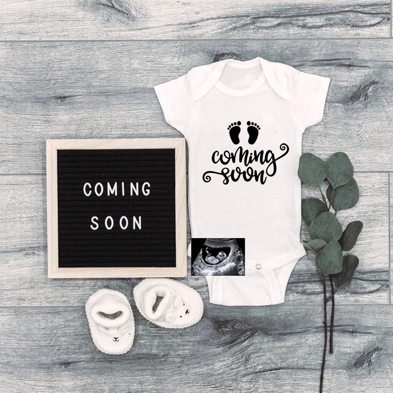 Your first baby makes the baby announcement. When it was printed I simply cut out around my stencil and ironed the stencils onto the front and back of the onesie. These Bodysuits are made to order and custom to your due date.